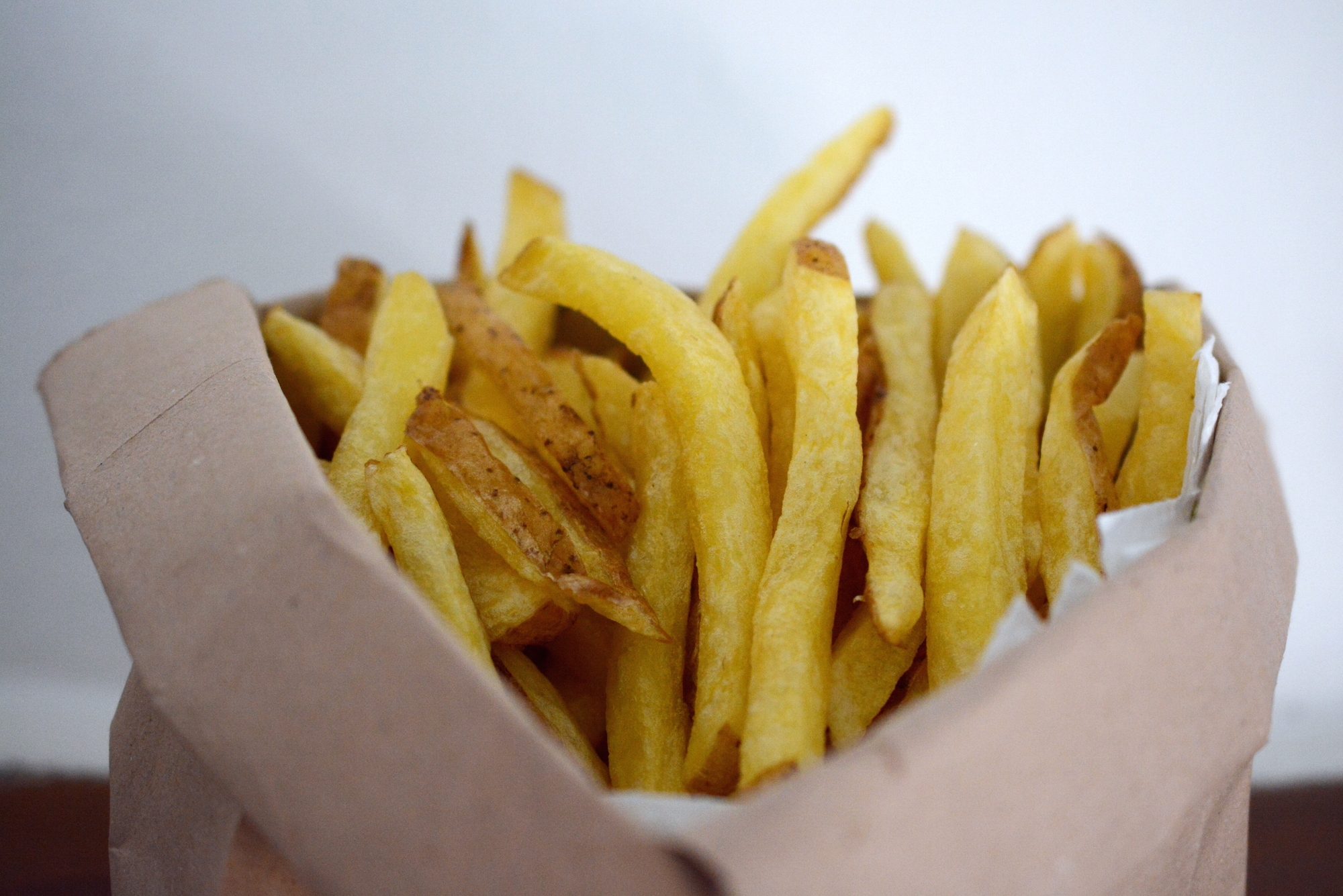 Lì le patate sono tagliate a mano, un formato più grosso rispetto alle “chips” a cui siamo abituati e vengono fritte due volte: la prima frittura le cuoce, poi vengono messe in appositi “scolatoi” dove si raffreddano e scolano l’olio in eccesso, infine vengono fritte – al momento dell’ordine – altri 2-3 minuti per renderle belle croccanti. Alcune ricette tradizionali prevedono fritture nel grasso di bovino o nel lardo. Più per questione di costi che di otturazione cardiovascolare, ormai tutti friggono nell’olio vegetale.